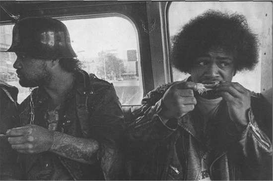 And no one looking at the photographer. The shot of Freddy and Skippy eating chicken is aimed directly between them, while they look out different sides of the frame. Again, this implicit drama of the photographer's presence is what enlivens the portfolio. As with the apprentice portrait, it is perfectly appropriate, in this case to the paranoid balance between play and violence.