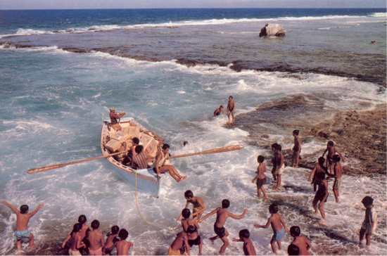 What kind of consent do we read in the Bed of Hats from Lincoln St., Ponsonby? The question rescues the photograph from quaintness. In the context of such small dramas, the photograph of unloading supplies in Mauke, Cook Islands, where numerous children ignore the photographer's unusually distant perspective, has a tone of mixed celebration and elegy: the pictorial qualities celebrate; but the distance, obliviousness and frozen-motion overlay a documentary nostalgia.