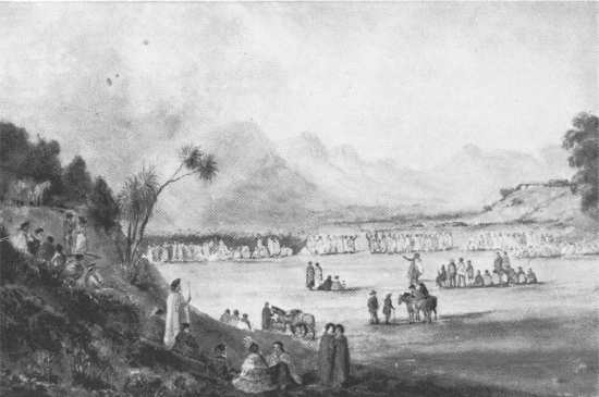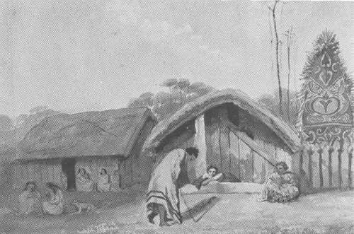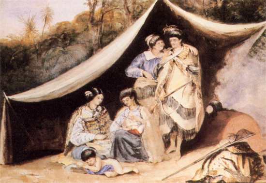 For instance, Oliver's depiction of the important meeting between Grey and Te Rangihaeata was reproduced. One plate, Strangers. House, Hauraki Pa, showed a typical pa and traditionally dressed figures, while several lithographs (including one based on the watercolour A Group outside a tent, Pomare's Pa, Bay of Islands), presented half - castes, for whom Oliver seemed to have a special attraction: 'the finest mixed race in the world', he asserted.(5)