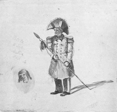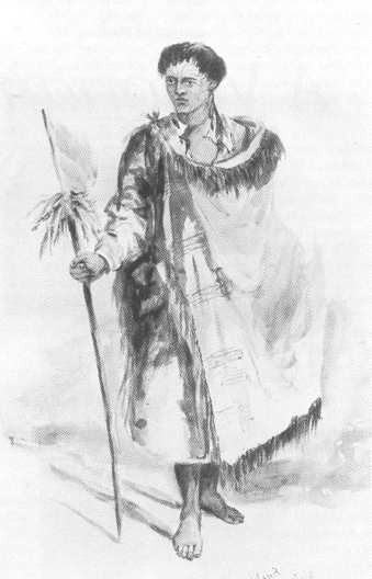 His male figures tended to be primarily clothes-hangers or exotic 'specimens'. Bland-looking, their Maori identity was conveyed by a weapon, cloak or tattoo - all suitably picturesque items. Consider Oliver's comment about the Maori adoption of European clothing: 'There is no-one with the least feeling for the Picturesque who does not lament the change of the native costume.(1) Oliver did though show Maori figures in European dress, even if in the case of Te Rauparaha he considered it 'ludicrous':'On his head was a magnificent hat trimmed with ostrich feathers ... in blue frock coat with naval epaulettes'.(2) That too had the makings of a good picture.