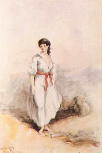Whatever the degree of attention to dress, rather than being faithful records of the Maori as they were, his figures are stock types, who, in look and facial feature, are generally more European or ethnically non - specific than Maori. For instance, his sketches of young Maori women, like those of his contemporaries Angas and Merrett, were modelled on a type of femininity, the keepsake type, that had widespread and popular currency in European visual imagery of the day - particularly in the fashion - setting periodicals, genre paintings and illustrated travel books. Basic ingredients of this type included pretty, dainty, gently-curved faces and forms, pert lips, large eyes, a look of gentility (even if the location was rustic), and a suggestion of fragility or wistfulness. Oliver's Sophia Gray, is a good example.