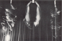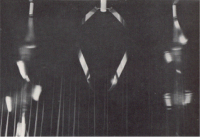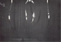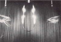 But no. Trilogy (A Flip and Two Twisters) is timed to follow Blade. So you turn away and move onto a balcony slung midway in a space some two storeys high and draped in black. Trilogy's there, suspended in that space. The Govett-Brewster is a converted cinema (Lye must have liked that) and something very theatrical is about to happen. Two strips of high tensile stainless steel twenty feet long hang there. Between them a thirty foot band of steel seven inches wide and a mere three thirty-secondths of an inch thick hangs in a great loop. The twisters begin to turn, to curve into scimitars, scythes, twirling and slicing the dark air and flicking lights across the curtains. This time the whoomph-whoomph starts deep and slow. You don't want to be where I was, down in the pit for a photograph giving the scale of the thing, but up on the balcony where your head won't get sliced off when those blades break loose from their moorings and cut up kingdom come like they surely will. For the twisters keep picking up speed, bending S-wise, the noise disappearing (which is somehow worse) until, unexpectedly, the brakes are applied and they come crashing down in a shower of light and with a sound that'd make the dead turn in their graves and made, it's said, at least one foetus turn in its womb. Len Lye is forever, no messing around.