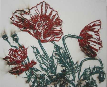 This critique of China’s culture and society revisits the past. Various flower drawings hang in the balance, awaiting a naked flame. The flowers: Iris, Rose, Sunflower, Carnation and Poppy are universal symbols of Revolution. Poppy, an image Tan has used previously, stands as a poignant reminder of the Opium Wars; the smoke stained canvas carries the shadows of China’s past. To watch the burning of a Tan drawing is a rare treat, a spectacle that literally sparks discussion.