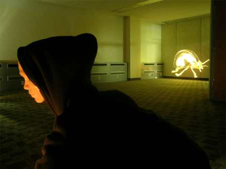 The darkened room that is home to Sam Eng’s installation, He knew they could not see him so long as he kept focus on the light, delves into the mind of a delinquent. The eyes of Eng’s manikin— costumed in PJ’s and a hood—glow red. The demon child holds a magnifying glass to the light, spotting and destroying bugs that cross his path. A projection of a giant beetle faces the doorway—the one that got away.