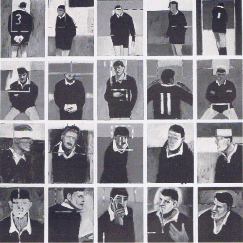 The Emblems of Identity exhibition featured paintings of All Blacks in variously heroic or anonymous poses. The collective mentality, the system, is shown in the monumental Black Order (1989-90), where vestiges of individual identity are lost. The players are types, stern and foreboding, entrapped and ordered by pictorial construction lines and layers. Some make eye contact with the viewer - the cultured gallery-goer - and look on mockingly, or with genuine wonder.