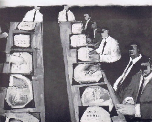 Mirror (1990) is a possible self-portrait, about the loss of self. A lump of pallid, dysfunctional flesh is masked from seeing itself, and lost in grim white space. In the aptly-titled Hidden Identities (1990), a conference table is occupied by nameless, faceless, corporate overlords, with badly stained blotters. The back-drop, once again, appears to be a McCahonian landscape, dark and austere, possibly a real painting in the picture’s boardroom. Mark Braunias continues to develop these twin concerns of individual and national identity, and the relationship between the two. Both are ongoing processes, never reaching a final and certain point. In both, art plays a crucial part, and this is investigated by Braunias from the standpoint of an ironic Regionalist style. His is an art about how we look at art, and how we look at ourselves.