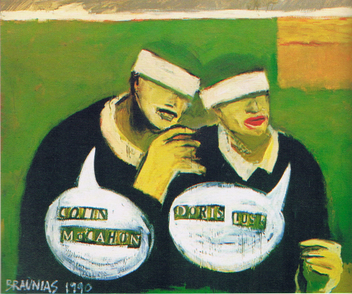 Earlier work by Braunias was more specifically art historical in its investigation of regionalism. One painting entitled Foreign Intervention (1988) for example, depicts a meeting between the Madonna of the Annunciation and Donald Duck on a modernist colourfield, in turn suspended over a McCahon landscape. Another charming image, My Parents Always Saw Themselves in This Picture (1988), adds a black-singleted, white Y-fronted man and plaid-skirted woman to Picasso's troupe of Saltimbanques. With this textual layering Braunias illustrated the contradictions of regionalist art.