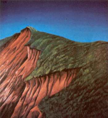 The strongest pieces in this exhibition were a series, The Earth Series, five paintings in which the artist reveals the wounded soil. Here the tension between realistic and surrealistic levels of approach combined with good technique to produce strong images of erosion. It could be an inward erosion: a process of upheaval and destruction. But this erosion is also quite literal. We are looking at collapsing New Zealand land-forms eloquent of our long-lived habit of compulsive land-rape.