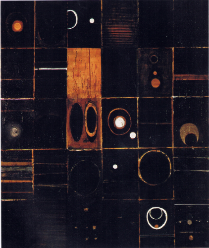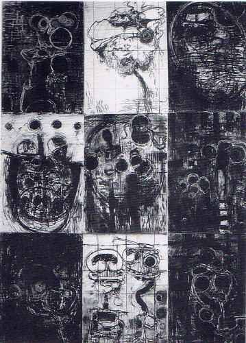 The A4 page is Braunias’ natural habitat (his brush delivers body blows, but his nib feints), and in his most spectacular works he assembles up to 150 such pages into huge grids, riffing his way restlessly, rhythmically across their surface in twink and ink and shellac, coaxing up fragments of figures from the inky surface. Such works resemble story-boards or comic-strips, except that the plot’s scrambled and the humour’s pitch-black. Of late this filmic format has surfaced on Braunias’ canvases as a tarry vestige of the Modernist grid. They’re action-packed, these works, dense with invention. Shellac bleeds down the grid. Novas pulse and dilate. Windows and grilles open into it. Wiry lines leap across the cells, like electricity between cathodes. And over such cells are fastened acetates, like x-rays on a lightbox, yielding double exposures.