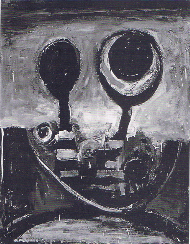 The eyes have it. Big, black, unblinking, they stare broodily out into the gallery space, eyeing you up and staring you down—at once ugly and benign, strange and sad. Close cousins to the huge hairy eyeballs in Philip Guston and Robert Crumb, they're struck onto canvas and paper in gutsy swipes of oil or enamel, and they crane upwards through the churning paint like periscopes. The eye is the psychic heart of the face, and it is the antenna with which a painter reads the world. Thus do these images press on your mind as an oddly tender portrait of the Painter as a tragi-comic anachronism, peering out with hope and apprehension at a world that has no need for his art: a naked eye stranded in an alien landscape, good for nothing but looking. 'Only an eye', as Braunias has scribbled in one of his workbooks, 'but my God, what an eye!'