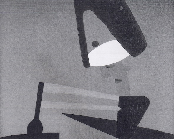 My favourite painting in the exhibition is entitled Journey (1995). The painting is not only beautifully composed, it also provides a way into a particular quality of Stevens' work. A figure with a jaunty white cap, punctuated by a red pom pom, is manfully paddling his way to some unknown destination. And all would be well, except he is so wilfully oblivious to everything other than his destination, he doesn't notice that he's about to be swallowed by a whale descending from above. His cap is already disappearing into its gaping jaws. His journey is about to begin in a very unexpected way.