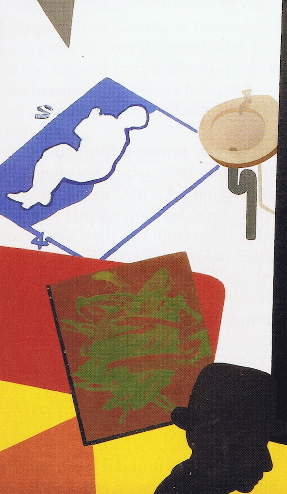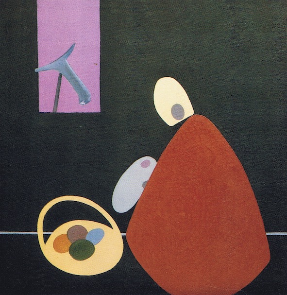Adoration of the Child (1995) is described as 'an improvisation on a painting by Tintoretto in the same manner that Miro briefly explored in the late twenties', but such a description does no justice to Stevens' painting. As Caroline Barnes points out in her essay which was made available at the exhibition, in the original, the mother and child are the most important elements, compositionally and emotionally. In Stevens' painting, the basket of eggs or gifts is larger than the head of the mother and much larger than the figure of the child. And I would add, the importance of the basket is further accentuated by being painted in a rich golden yellow, whereas the mother's head is a lighter yellow, and the child a gray shape which recedes into the surrounding black wall. We can ask, What kind of world is this, when a child is less important than the gifts intended for it?