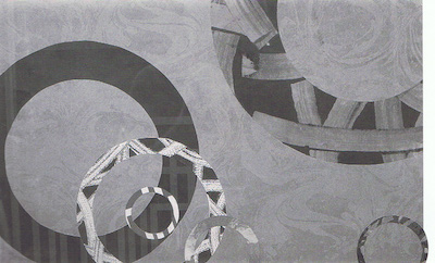 'The problem now is how to make a painting out of collages. A lot of painters stick pieces on but I find the separate pieces have to be flush with the surface, sunk into the gestures of the paint. 'The tumbling strains actually tumble out of the picture. Its making reference to the outside of the painting. I've allowed the circles to tumble off the edge and reorient themselves again. 'Circles have no orientation. A lot of artists don't like them. It's a bit like using grids: if you can't work out the painting, you grid it.' He shakes his head. 'How many painters have done that?' 'For convenience,' Robinson says, Tumbling Strains is named after the musical score screened onto the piece, but his other works are mostly unnamed. 'I normally don't think about titles, but people like them . . . I'm even starting to do something representational with the music screened on. Screen-printing something figurative into the paintings!' he laughs. 'It's taken me years to get around to it.' Another composition takes place against oil-on-water marbling, photographed and screen-printed as a background. The graphic technique belies a printmaker's approach: capturing accidents and repeating them as motifs and devices. The idea is 'to collage spontaneity' as Robinson puts it: 'I liked the spontaneity of [the marbling], but only if it's organised. I don't allow the gesture to be the painting. It's important to do more. You've got to capture and use it. You build up intuitive awareness to capture the accident. Intelligent behaviour is not how cleverly you organise things, it's the apprehension of the facts themselves. The sensuous apprehension. Not appreciation— that's a learned response, like politeness and manners. No: it's a case of developing the sensuality to apprehend the things that are floating around. 'I spent a week sitting down just cutting out circles—and I cut every one out of an old painting. I cut the circle out, so part of the new painting is the old one, mixing with the new direction all the time. I'm recycling! I'm out of that war generation where everyone recycles. Maybe I'm doing that . . . I mean, what am I going to do with the old works otherwise? I've got a little bit of all the things from the past in here.' As surfaces, patterns and colours accreted on the new pieces, so have the experiences behind them. 'That's a woodblock,' he recalls, holding up another monoprint, 'when the press was screwed down too tight. I was printing it and talking to somebody, talking about the way you capture accidents—and as I was talking it was happening. And now it's in the work.'
