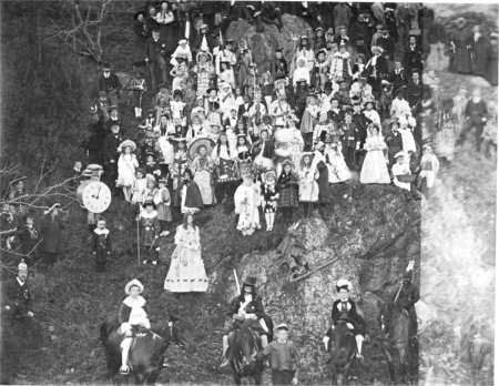 Children in costume on a slope (photograph from the Tyree collection, Alexander Turnbull library)