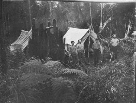 Timber workers' camp c1910, photograph from the McAllister Collection in the Alexander Turnbull Library