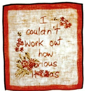 'I cannot remember much of what happened' occurs through several images of embroidered cloths, rags and cut clothing. "I couldn't work out how serious it was" is recorded on an embroidered handkerchief, its large awkward daisies obscuring the last three words. This image is then recorded in negative and positive form through the process of retrospective staining and processing with body fluids resulting from the ongoing medical interventions Clark calls 'tattooing' in relation to her body.