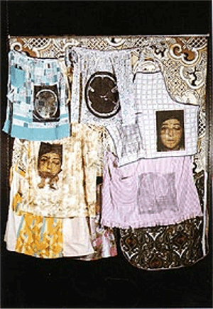 At the same time, in her home and its adjacent ex dairy-factory with its darkroom in the milk-rooms, collections of Taranaki's material culture accumulated. Knitting patterns, dress-makers dummies, scarves, embroidery, doilies, tea-towels with inscriptions and patterns, buttons, button-hooks, plastic tablecloths, Images of women dressed up to receive their new washing machines or Kelvinators. The trappings of a dated but still expressive gender were folded and maintained in an archive somewhere between museum and work-box. This collection was compiled by Clark and by her then partner, Tertius. In its consistency and in the way in which it seemed to grow naturally from the Taranaki environment this collection demonstrated a more than nostalgic interest. An archaeology of a particular take on gender was being constructed.
