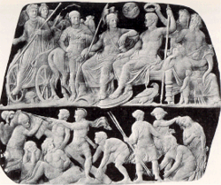 Augustus, accompanied by the goddess Roma, sitting in state whilst a figure places on his head a crown representing the civilized world (gem carved from onyx, c. 10AD)
